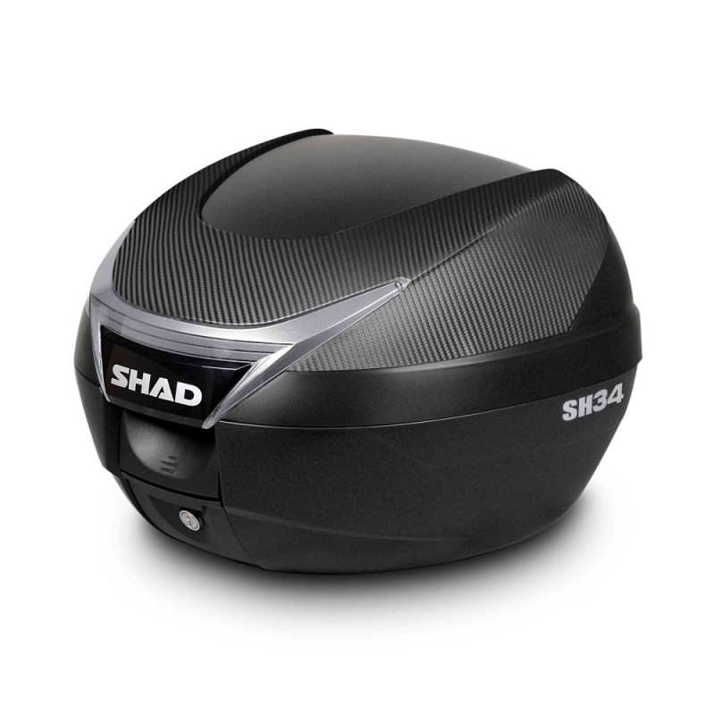 El baúl SH34 tiene capacidad para 1 casco integral + extras, perfecto para scooters o motos pequeñas. Incluye el sistema "Press Lock System", tapa de carbono y parrilla de montaje.